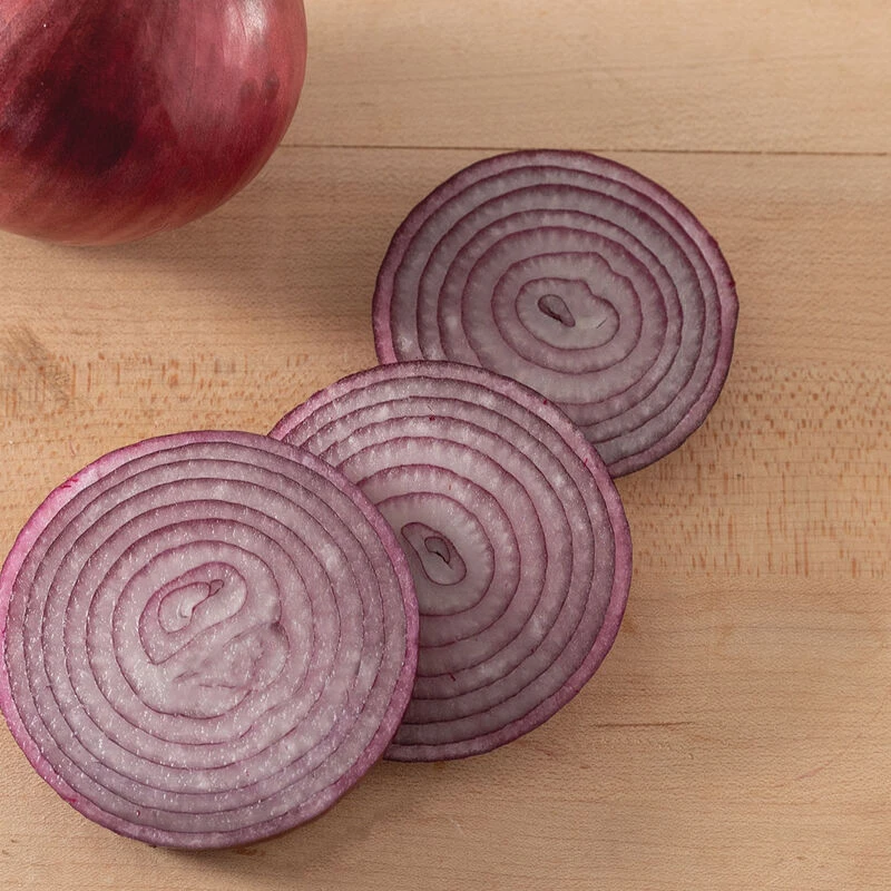 Long-day onion with globe-shaped, dark purple-red bulbs. Thick, smooth, complete skins with a glossy finish. Internal rings are red at harvest time, and the color improves in storage. Earlier maturity ensures fully dormant bulbs after curing. Large to jumbo size potential. Long storage (up to 6 months in our trials).