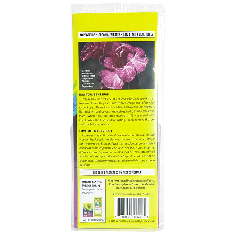 - The lure attracts Western Flower Thrips, other thrip species (and other insect pests) to both sides of the trap, and especially to the blue side, where they stick permanently to the non-toxic, pesticide free, no-mess stickum surface.